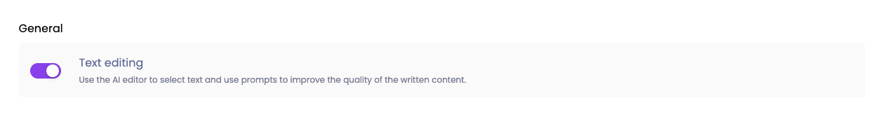 In the General settings part you can decide if you want to enable Text editing. With text editing you use the AI editor to select text and use prompts to improve the quality of the written content.