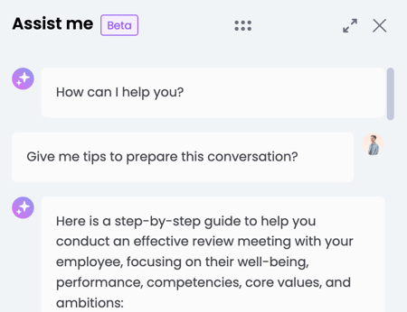 Depending on settings in the company account, as a coach you will see an “Assist me” button at the top right of the report. This job helps in analysing the evaluation report, structuring the conversation, naming strengths and development areas and encouraging open dialogue.