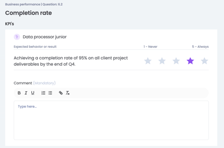 For each KPI from the job, a question is automatically generated with a rating scale, for example 1: 'Never' to 5: 'Always'.