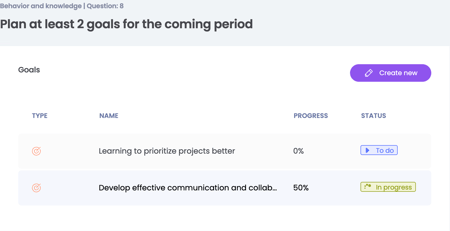 There may also be a question added to the form for the employee to think about his/her personal goals for the coming period. You can review these goals and possibly add other goals to this list. To do so, click create new.
