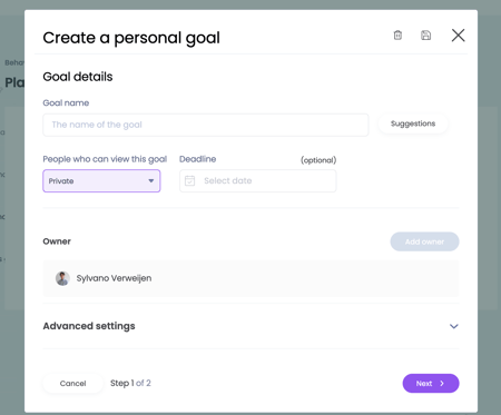 Here you can directly create a goal using 2 steps. All created goals can be found in the goals module of Learned.