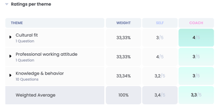 Click on ‘Scores per theme’ to see how this average score is structured. For example, the weighting can differ per theme. You can also compare your scores per theme with what your team member has filled in, or possibly his/her peer(s).