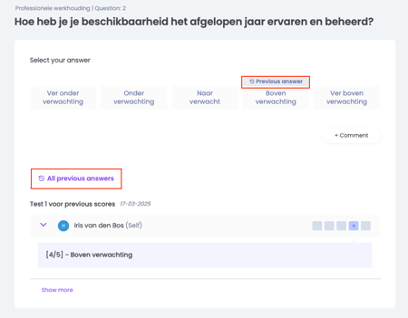 If Admin has enabled, when creating the cycle, that you can see your previous scores on the questions you answered in the previous review, you will see this reflected by a label ‘Previous answer’. Below the question, you will also find all previous answers to this question from different reviews, both from the self-review, and from the coach and peer review. This helps you in your preparation for the questions and you don't have to look for the old report first.