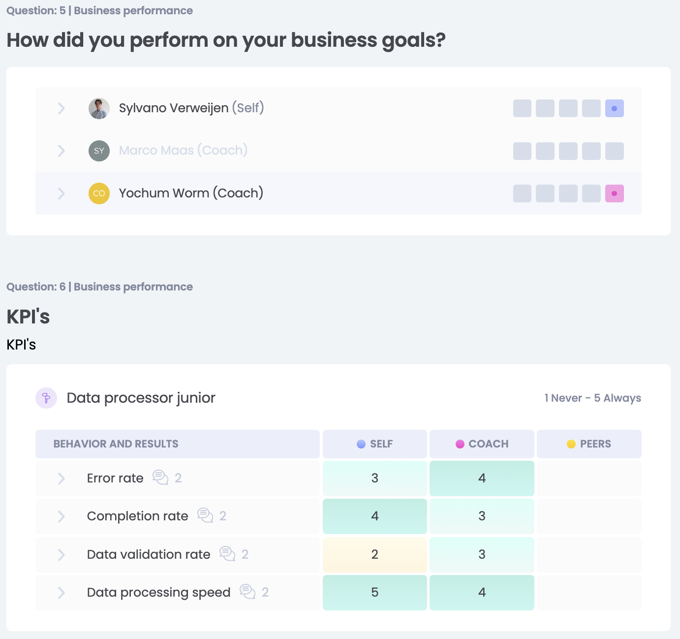 There are questions that require you to give a score, for example, for an review on skills or KPIs from the employee's job profile or on the company's core values. There may also be open-ended questions in the form, or questions to plan goals.
