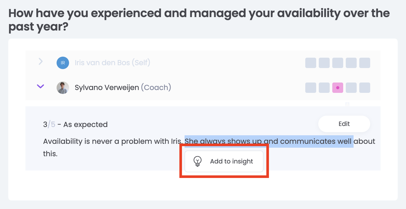 To save valuable information about an employee as an insight, you can select text from the review report and send it directly to Insights.