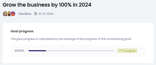 A company goal is always public for everyone in the organisation. It is possible that a company goal is impacted by different team or personal goals. Depending on the privacy setting of those goals and your rights in the platform, you may or may not see them appear anonymised underneath. For example, personal targets of employees are not visible when those targets have a privacy setting Private. However, this personal target does contribute to the progress of the organisational target and is therefore linked to it.