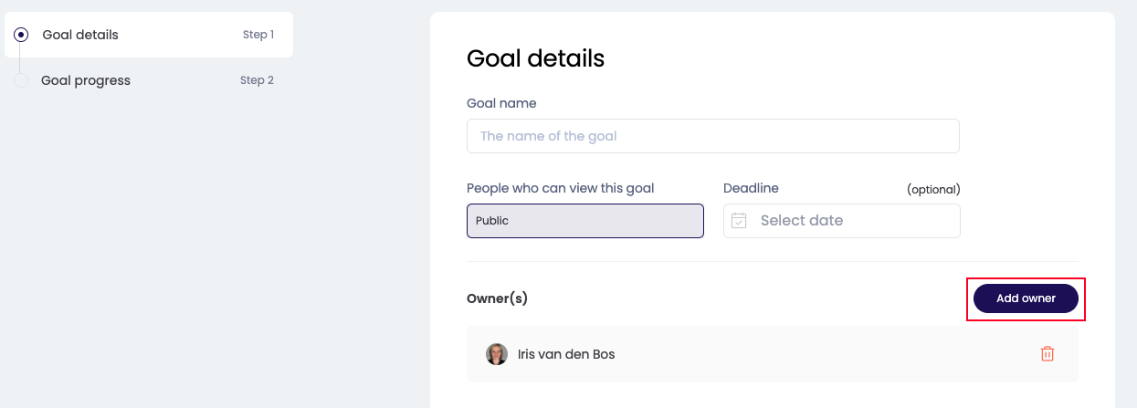 In step 1 'Goal Details', try to write down as concretely as possible what the company goal is. You can further substantiate this as you wish in the description field under Advanced settings. You can link several owners to a company goal. An owner of a goal has the responsibility to keep track of the goal's progress. If you, as Admin, want to only be able to track progress yourself, do not add any other employees.