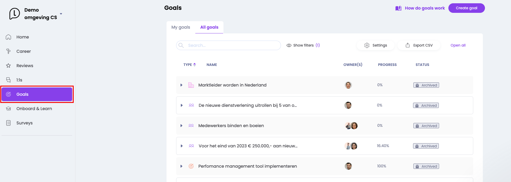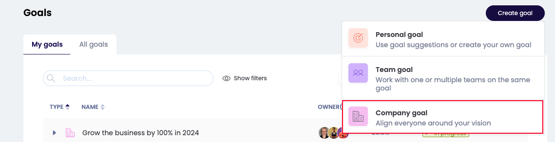 If you go to the Goals page, you will be taken to an overview page where you can see at a glance all the goals you are working on under the 'My goals' tab. So if you are an owner of a company goal, you will also find it under 'My goals'. The 'All goals' tab shows all goals within the organisation that you are allowed to see with your rights. Here you will find, for example, the other company goals you're not an owner of.