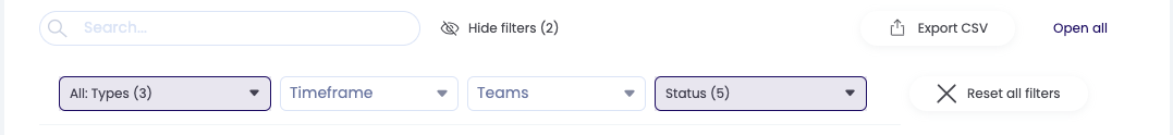 Using the filters on the overview page, you can filter by goal type (personal/team/company), time frame, team and/or status of goals.