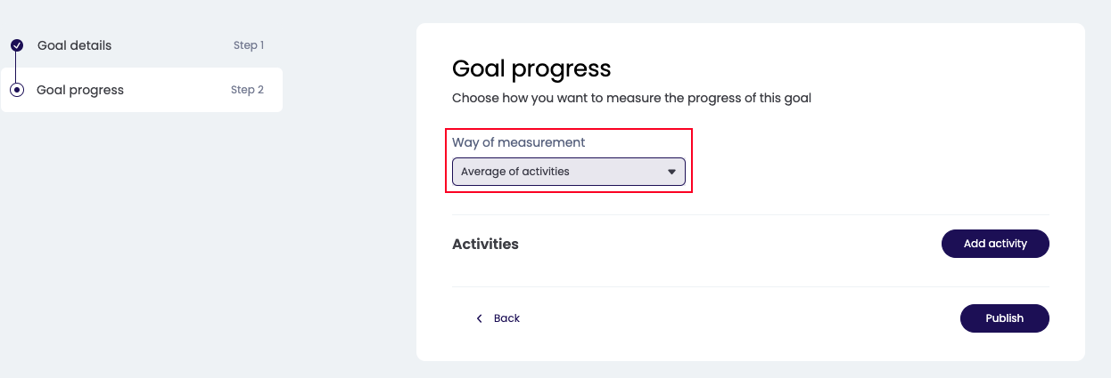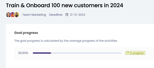 These activities allow owners of the team goal to track progress in the same way as the parent goal. So use these activities to make the team goal concrete with logical steps that the owners have to take and/or achieve in a certain order. You can express the activities in various ways. You can find this under the advanced settings when you create an activity.