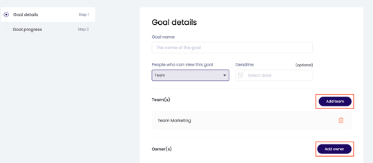 In step 1 'Goal Details', try to write down as concretely as possible what the Team Goal is. You can further substantiate this as you wish in the description field under Advanced Settings. Also determine who can see the goal. You can link several teams and/or owners to a team goal. An owner of a goal has the responsibility to keep track of the goal's progress.