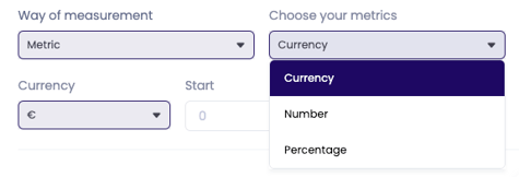 • Metrics: This option allows you to keep track of the organisation goal in currency, numbers or percentages. Set a start value and a desired end value. If necessary, add activities to make the goal concrete with logical steps to execute and/or achieve in a certain order.