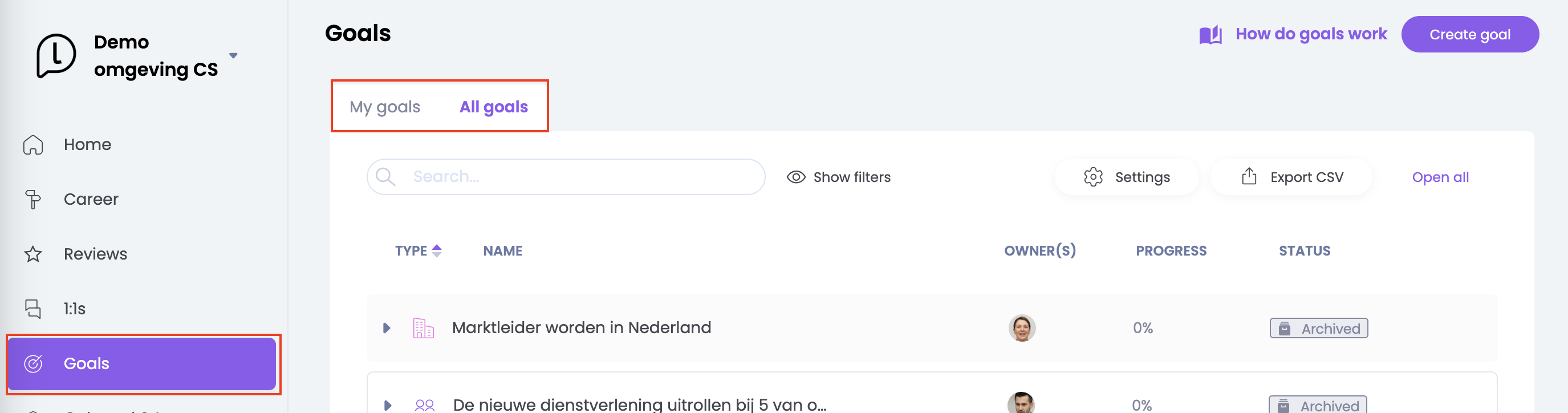 If you go to Goals you will be taken to an overview page where you can see at a glance all the goals you are working on under the 'My goals' tab. So if you own a team goal, you will also find it under 'My goals'. The 'All goals' tab shows all goals within the organisation that you are allowed to see with your rights. Here you will find, for example, the other company goals of which you are not the owner.