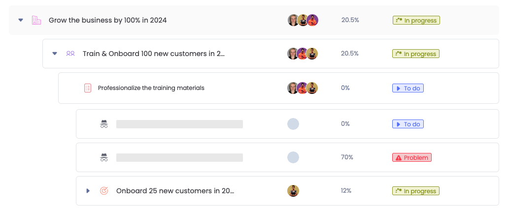❗️Note: It depends on your rights in the platform whether or not you are allowed to see underlying goals. If you are a colleague but not a supervisor of the employee, you will not see your colleague's goal as long as the privacy setting of that goal is set to Private.