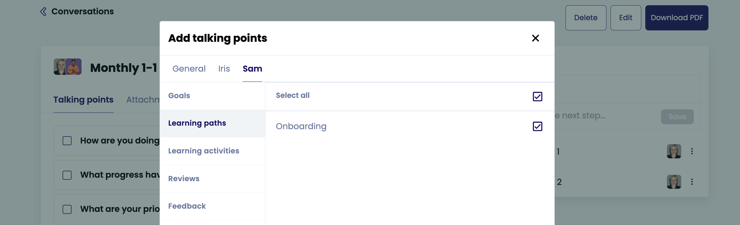 Both you and your coach can add the learning path or other learning activities you are working on as a talking point to your 1-1 conversations. You can easily click through to your learning path from the 1-1 conversation.