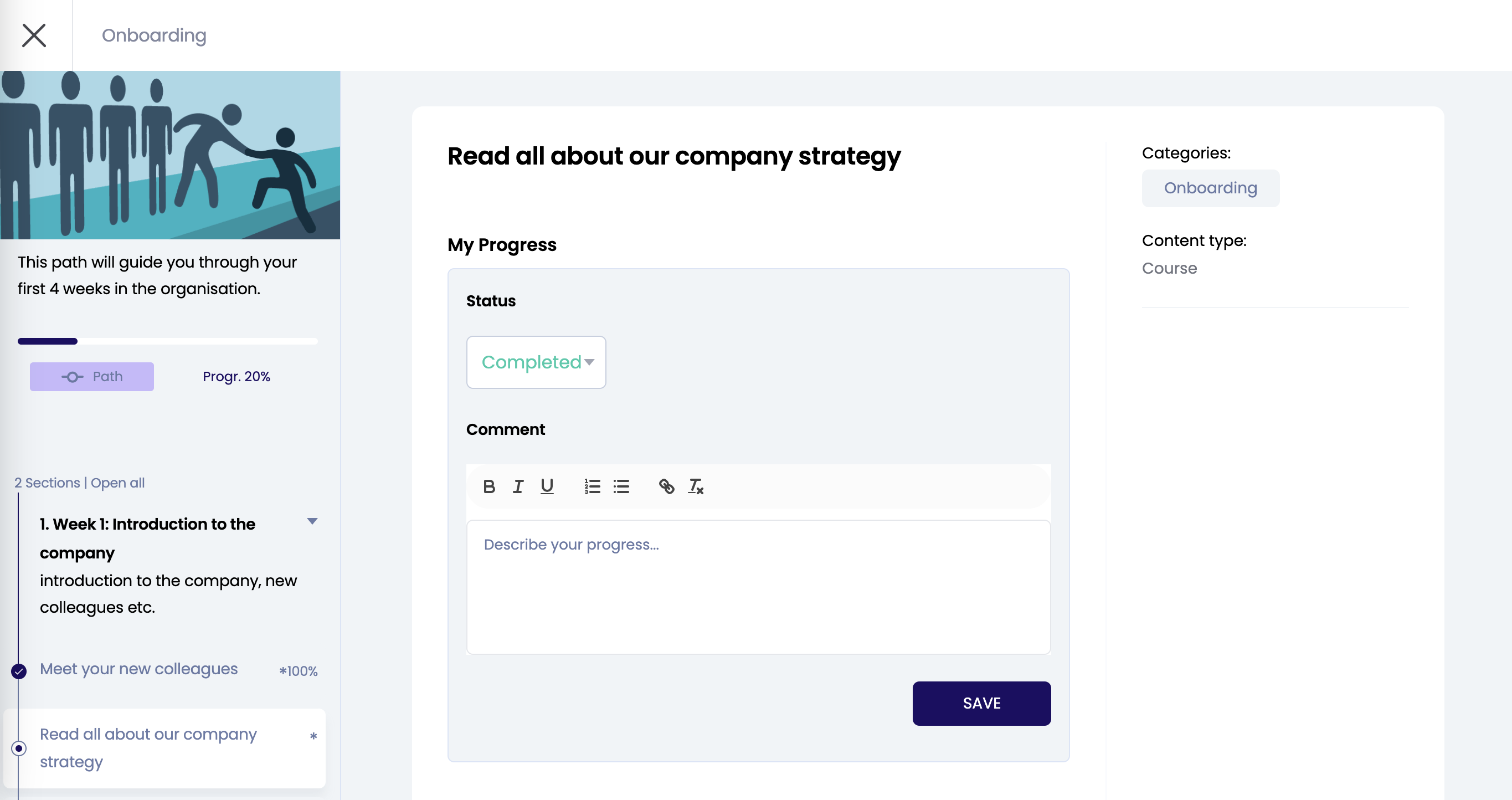 • The learning resources are, for example, courses, videos or articles that you must follow. Click on a learning resource on the left and update your status to keep track of the progress of this activity. When completing all activities your progress bar of the learning path will automatically be at 100%.