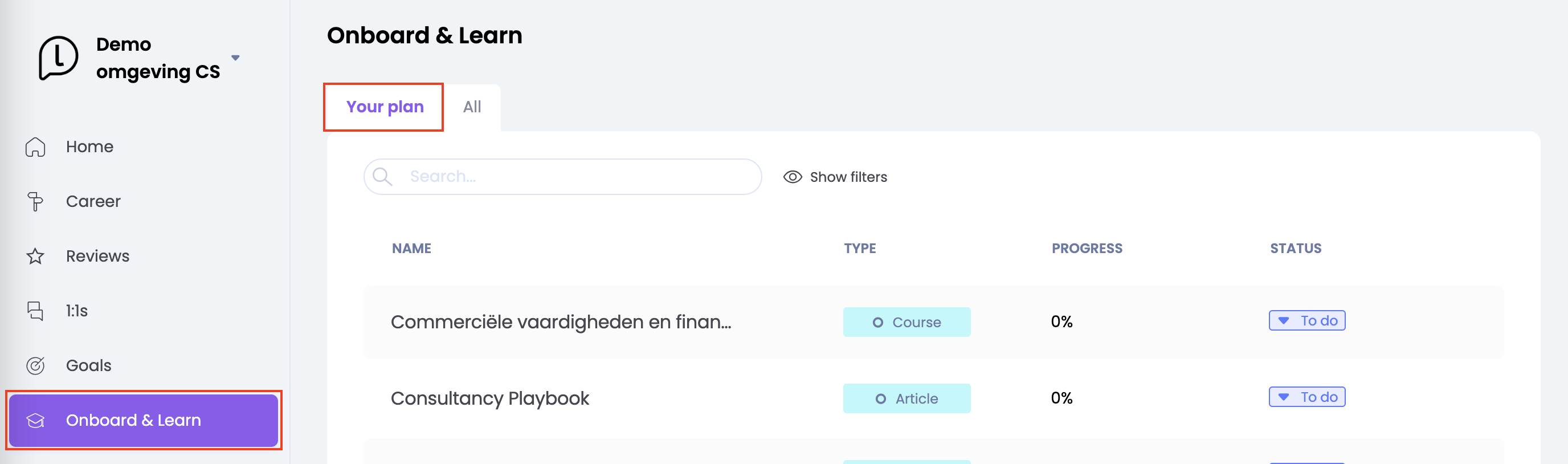 Tip: Of course, you can also get started with various learning resources outside the learning paths. When you go to the Development - Onboard & Learn page and you click on the tab 'All', you can browse the entire Learned library. On this page, you will see various learning resources that you can add to your development plan, or for example to one of your personal learning goals. The activities will be placed on the page 'Onboard & Learn' under the learning paths.