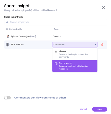 Once you have selected an employee, you will see that they are automatically designated as a responder. If you do not want someone to be able to respond to your insight, you can change their rights to “Viewer”.