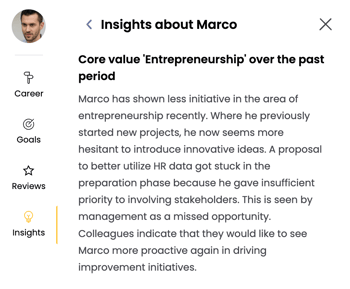 The system uses AI to suggest insights that contain information about, for example, completed 1:1s. These suggestions are displayed on the insights page. This option must be enabled in the organization settings.