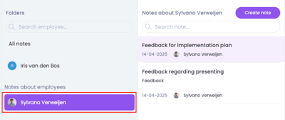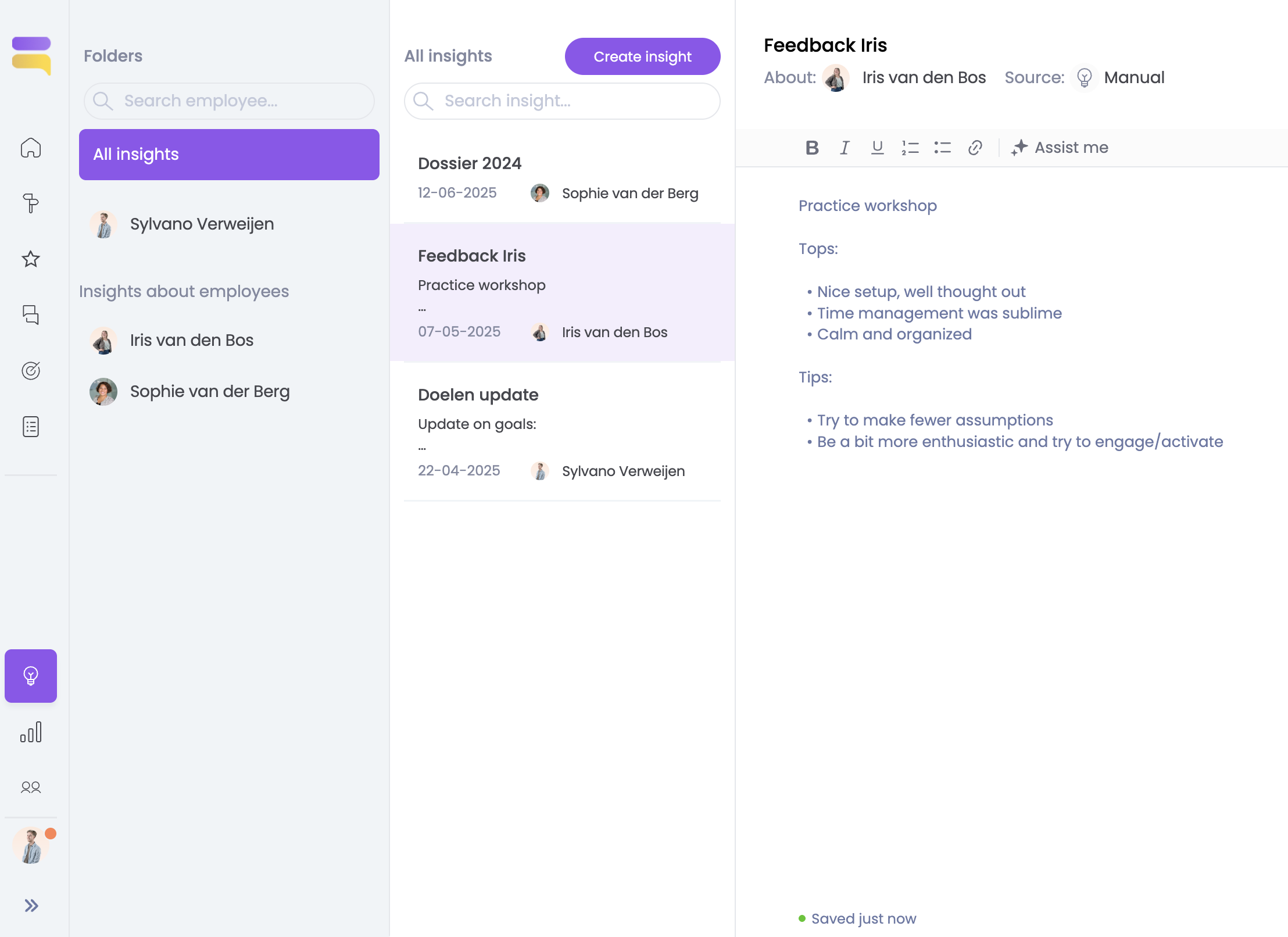 To view or create insights, click on the “💡” icon at the bottom left of the menu. Then click on “Create insight”. Choose which employee you want to create a note for, or create an insight about yourself.