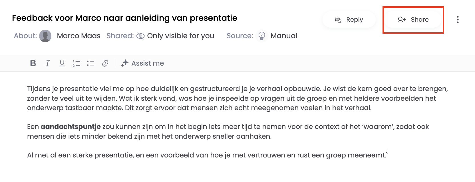 You have received feedback together with a colleague and write this down for yourself. You then want to share this insight with that colleague.