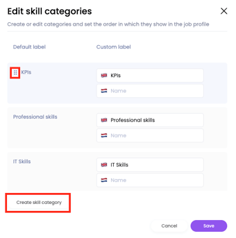 You can rename any of the existing categories, or if you work with multiple languages in your organisation, add translations of the categories. In this pop-up, you also have the option to add a new skill category.