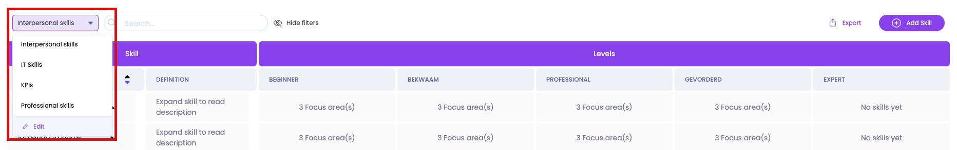 At Learned, we routinely divide skills into 4 categories: Interpersonal Skills, Professional Skills, IT Skills and KPIs. When you then start creating job profiles, you will see that the same skill categories are available to place skills in. By means of skill categories you can therefore logically divide the job profiles and in this way communicate to your employees what kinds of skills you expect from them. The skill categories appear in the following places in the Learned platform: