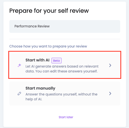 If your organization has enabled the AI settings to help prepare evaluations, you’ll see the following options when you begin your preparation: