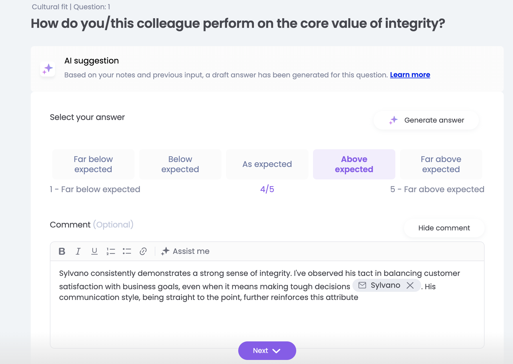 💡: By keeping notes about yourself or other employees in your notebook throughout the year, you’ll be able to make better use of the AI suggestions.