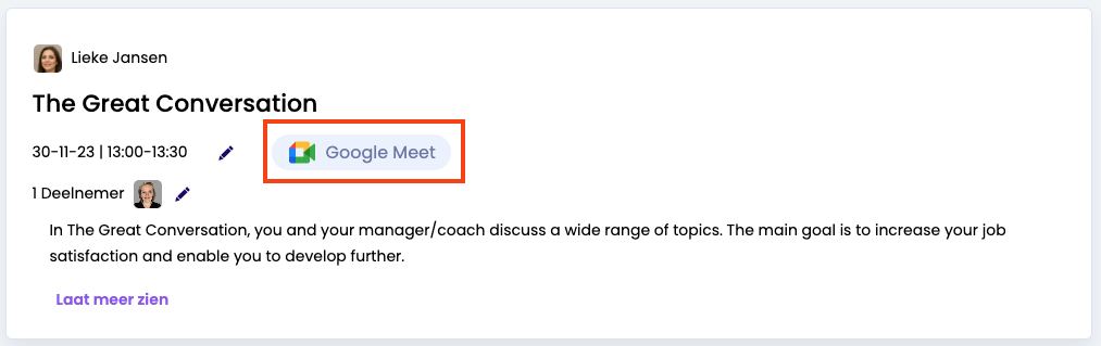 From now on, it is also possible to include a Google Meet or Microsoft Teams link when scheduling your call or 1:1 meeting. This means you can easily access the Google Meet or Microsoft Teams environment directly from the calendar item in your calendar or from the conversation in the Learned platform. No more switching back and forth between different platforms or manually creating Meet links for each meeting.