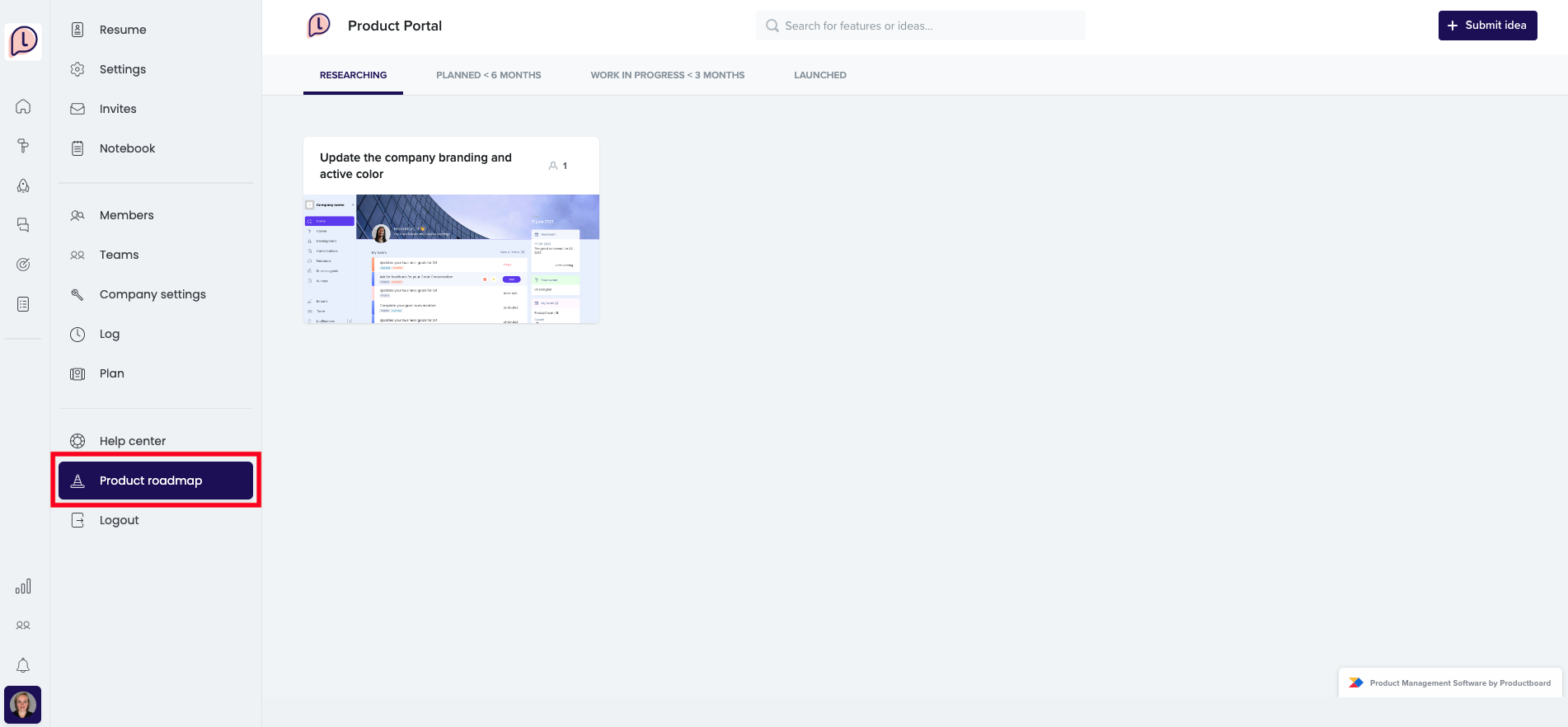 The Product roadmap is available to all Learned users and gives you insight into the different projects we are working on. You can find the Product roadmap by clicking on your profile picture and choosing Product roadmap:
