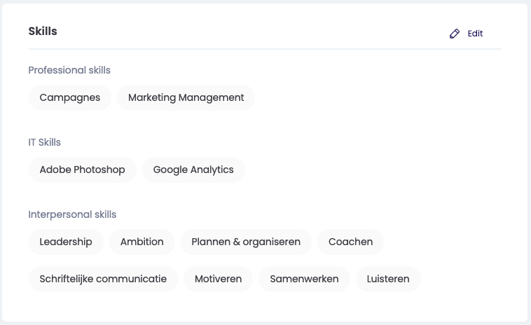 Under skills you can see the skills linked to your current role. Via the Edit button you have the possibility to hide certain skills, or to add other skills that you think you possess.