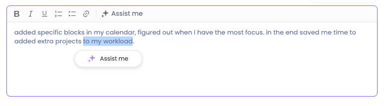 💡 Als je alleen hulp van AI wilt voor een paar woorden of een bepaalde zin binnen een grotere tekst, selecteer dan de specifieke zin. Er verschijnt een knop ‘Assisteer mij’ onder de geselecteerde tekst om je te helpen met dit specifieke deel van de tekst.