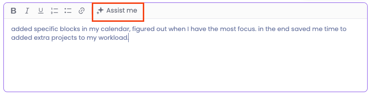 Als je je gaat voorbereiden op een evaluatie en je moet meerdere tekstvragen beantwoorden, of als je een samenvatting schrijft in het evaluatierapport, kun je AI-tekstbewerking gebruiken. Hiermee kun je AI vragen om je antwoorden te verbeteren. Vul een paar woorden of zinnen in om de vraag te beantwoorden. Klik vervolgens op de knop ‘Assisteer mij’ in het tekstgebied.