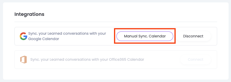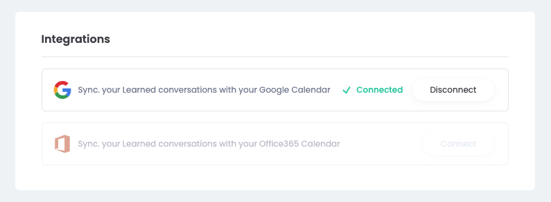 In Learned heb je de optie om je Google of Outlook agenda te integreren. Dit betekent dat alle gesprekken en vergaderingen die je in Learned plant, automatisch in je Google- of Outlook-agenda verschijnen.