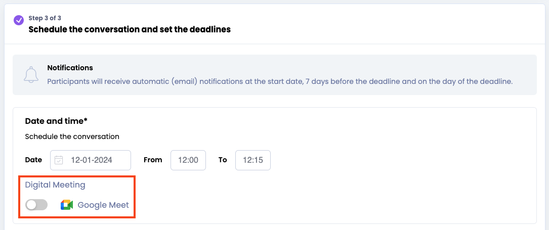 ❗️Let op: Admin kan geen Google Meet of Microsoft Teams link toevoegen bij het maken van een gesprekscyclus.