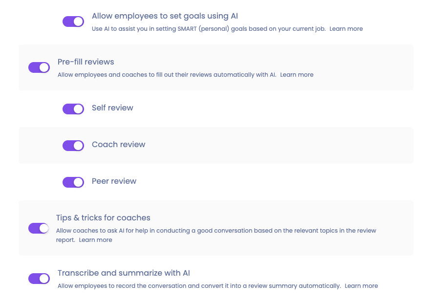 Medewerkers kunnen doelen opstellen met hulp van AI en zowel coaches als medewerkers kunnen hun reviews automatisch laten invullen. Coaches krijgen tips van AI om het gesprek goed te begeleiden en we hebben de optie om gesprekken automatisch op te nemen en samen te vatten.