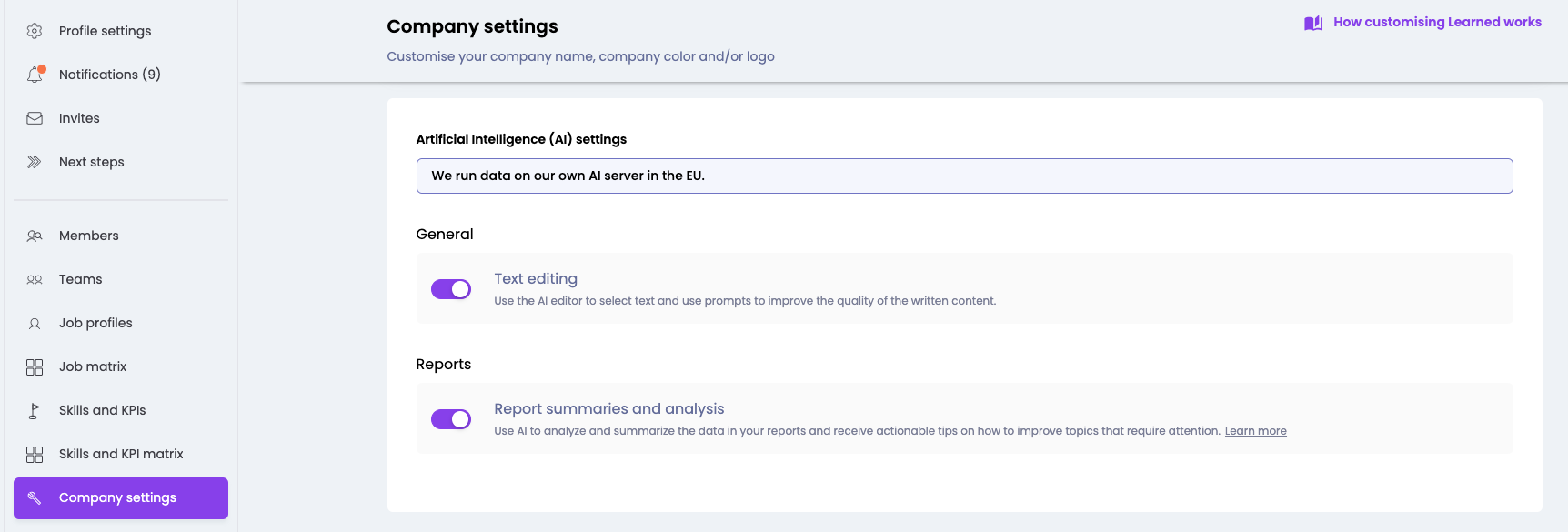 Dit artikel legt de verschillende AI instellingen uit die je als Admin kunt instellen in Learned.