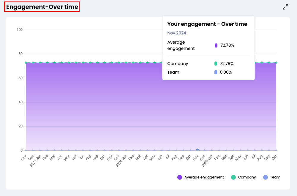 Over tijd: Hier zie je een tijdlijn met jouw Engagement score. Wanneer je meerdere surveys hebt ingevuld, zul je hier je score zien na verloop van tijd. Hier zie je dus in één oogopslag jouw score na verloop van tijd. Je kunt jouw score hier ook vergelijken met de score van jouw team en de hele organisatie. Deze scores verschijnen met een stippellijn in het rapport.