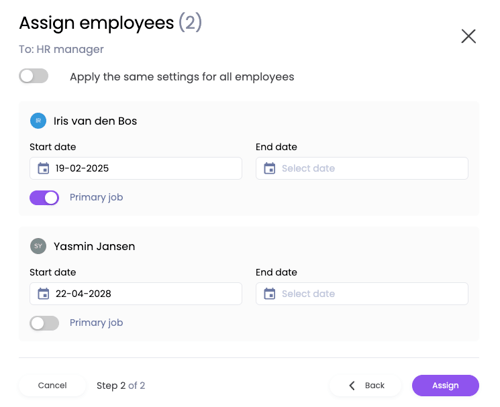 Je ziet de optie om meerdere medewerkers aan een functie toe te wijzen, met dezelfde begin- en/of einddatum. Je kunt ook verschillende data instellen voor de individuen en selecteren of dit de primaire functie is, of is geweest, van de geselecteerde medewerker.