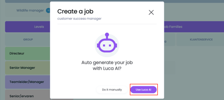 ❗️Let op: Als je met een HRIS integratie werkt, kun je de functies ook via de integratie importeren. Vervolgens heb je de mogelijkheid om KPI's en competenties inclusief gedragingen voor deze functie met behulp van Luca AI te genereren.