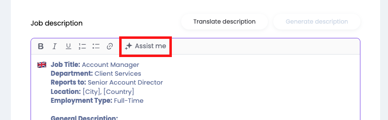 De “Assisteer mij”-knop helpt je snel verder wanneer je ondersteuning nodig hebt bij het schrijven of aanpassen van teksten. Klik op deze knop om slimme AI-suggesties te krijgen, bijvoorbeeld voor het verbeteren van een beschrijving, het schrijven van een titel of het aanvullen van ontbrekende informatie.