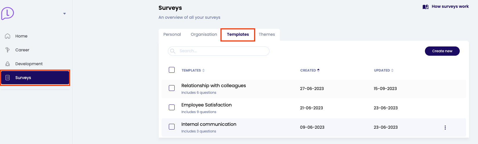 Survey thema's vormen de basis voor de templates. Wanneer de thema's gereed zijn, kun je een survey template gaan creëren. Het aanmaken van een survey template doe je onder de tab Templates. Dit is ook gelijk jouw overzichtspagina met alle templates die je hebt gemaakt voor eerder verstuurde surveys. Een template kun je zowel voor een traditionele survey als voor een pulse survey gebruiken.