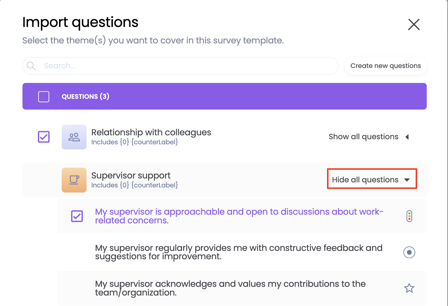 Bij het importeren van vragen aan het template, zul je de verschillende thema's zien verschijnen. Je hebt de mogelijkheid om alle vragen gekoppeld aan een thema direct aan het template toe te voegen. Daarnaast kun je ook een thema openen middels de 'Toon alle vragen'-knop. Je kunt vervolgens ervoor kiezen om slechts een selectie van de vragen van een bepaald thema toe te voegen aan je survey template.
