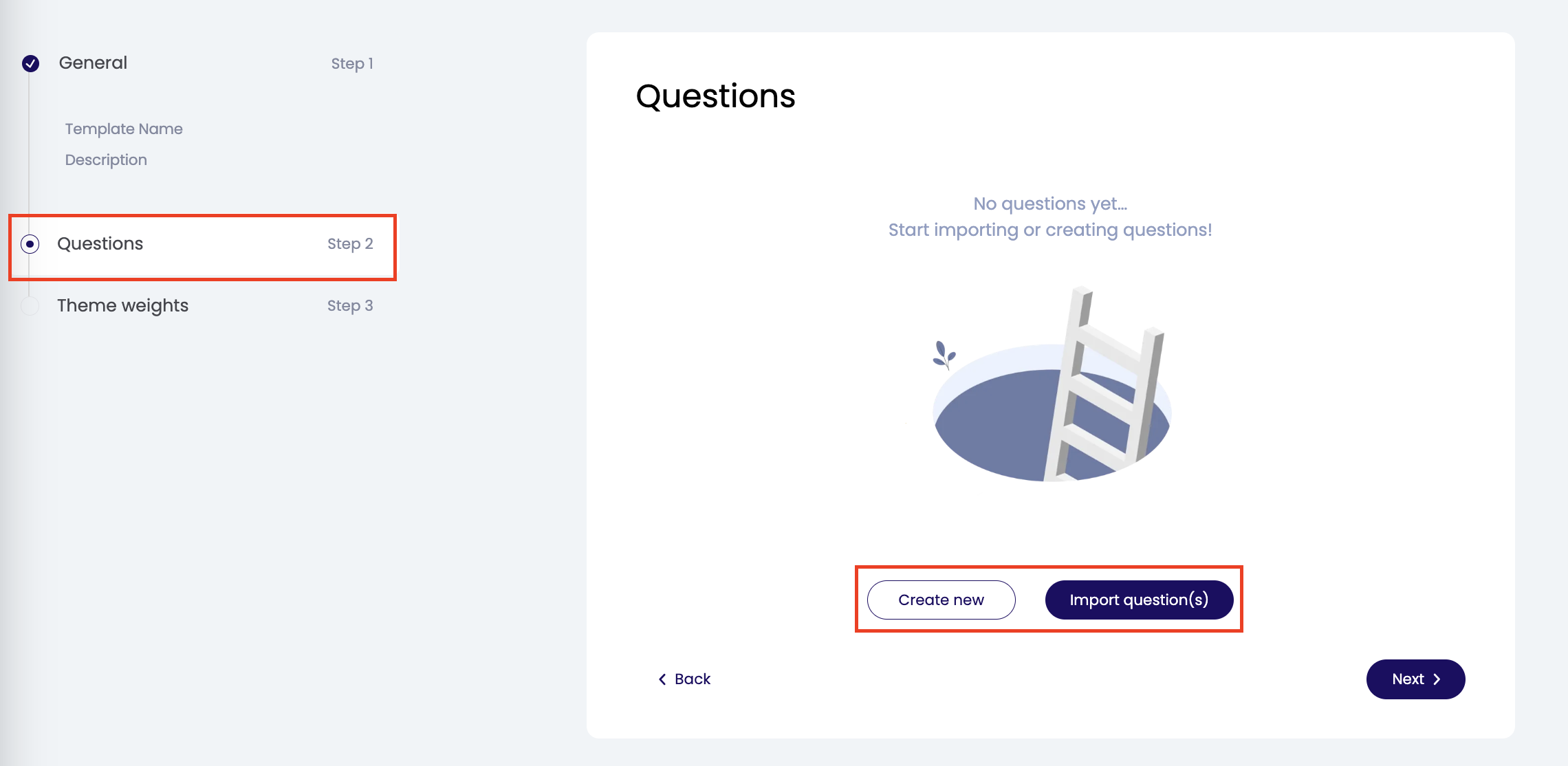 Wanneer je naar stap twee gaat, ga je de vragen toevoegen. Je kunt zowel een nieuwe vraag direct aan het template toevoegen als vragen importeren.