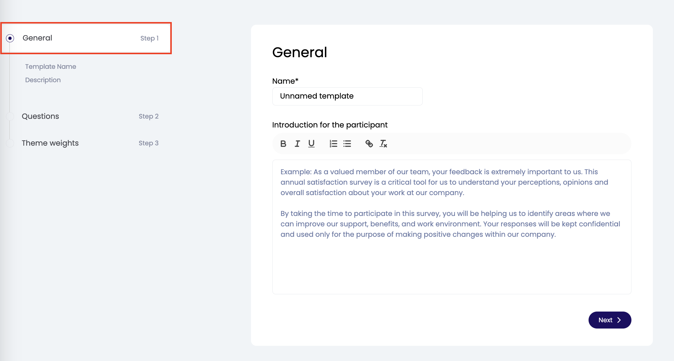 Het aanmaken van een template is opgedeeld in drie stappen. In stap één ga je het template een naam en een introductie voor de deelnemers meegeven.