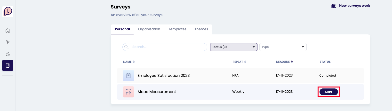 Ook wanneer je voor een Pulse survey wordt uitgenodigd, vind je deze terug op de pagina Surveys. Ga naar de Pulse survey en klik op 'Start'.