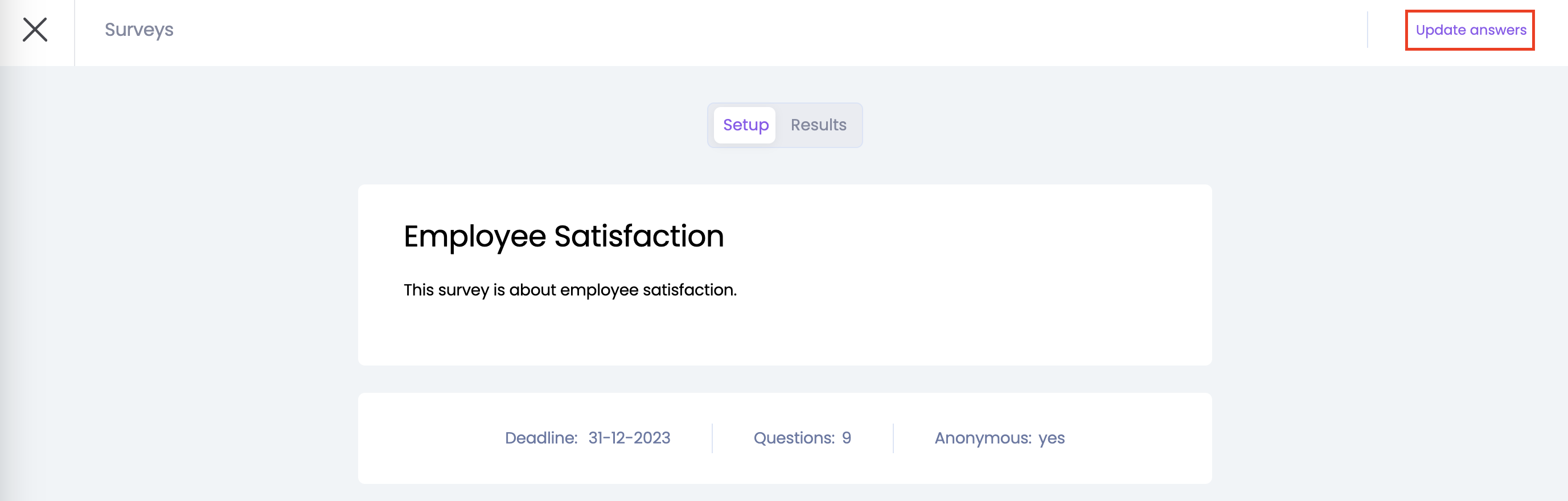 Daarnaast vind je de Surveys ook terug op de pagina Surveys links in het menu. Vanuit hier kun je ook aan de slag met de survey, jouw antwoorden aanpassen zolang de survey actief is, en jouw resultaten bekijken gebenchmarkt ten opzichte van de resultaten van de organisatie.