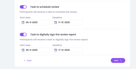 • Bij stap 4: Tijdlijn kun je de deadlines per taak aanpassen. Daarnaast kun je het uitnodigingsbericht bewerken. Wanneer je de opties inschakelt waarmee deelnemers hun review kunnen inplannen of ondertekenen, kun je daarvoor ook een deadline instellen.