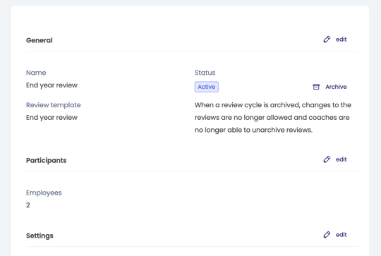 • Bij stap 3: Instellingen. Je kunt besluiten dat je niet wilt dat de ronde automatisch na 30 dagen wordt gearchiveerd. Verder kun je nog een wijziging doorvoeren in de automatische notificaties en in de privacy instelling. Ook vorige scores kun je nog (de)activeren zolang de status van de review aankomend of actief is.
